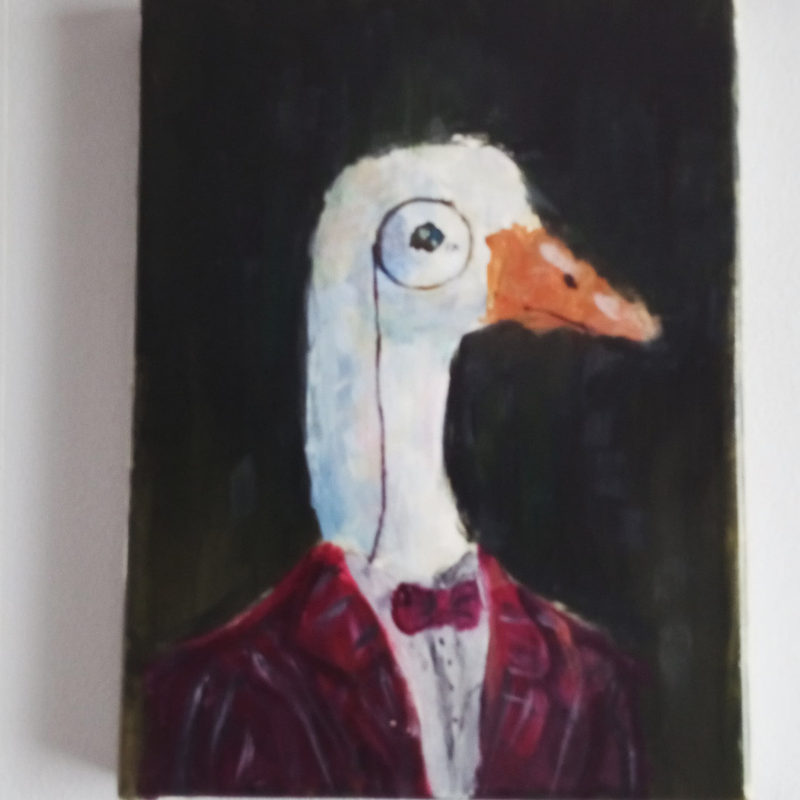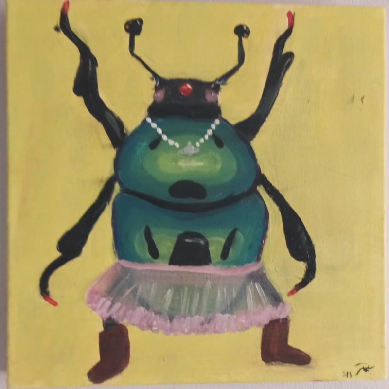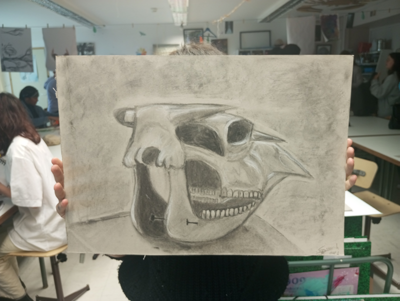 Afin répondre à la thématique de “la lumière”, j’ai décidé de représenter celle-ci de manière métaphorique, en tant que source de savoir et de puissance, à travers une représentation de Jésus-Christ, le fils de Dieu et Seigneur sacré dans la religion chrétienne. Dans cette œuvre, son visage est noirci, de sorte que l’on ne distingue qu’une bouche avec une rangée de dents blanches, des gencives visibles et trois yeux vides, entourés de cernes violacés, presque invisibles dans la pénombre de son visage sombre. Il porte une sainte tunique rouge, comme dans les diverses représentations à travers les siècles. Le Seigneur tient entre ses mains, percées par les clous de la crucifixion et dégoulinantes d’une substance noire, deux sources de lumière qui semblent émaner de ses paumes. Il est également entouré d’une douce lumière jaune qui semble provenir de lui, mais également d’un halo rougeâtre se dissipant dans l’ombre le rattrapant peu à peu.